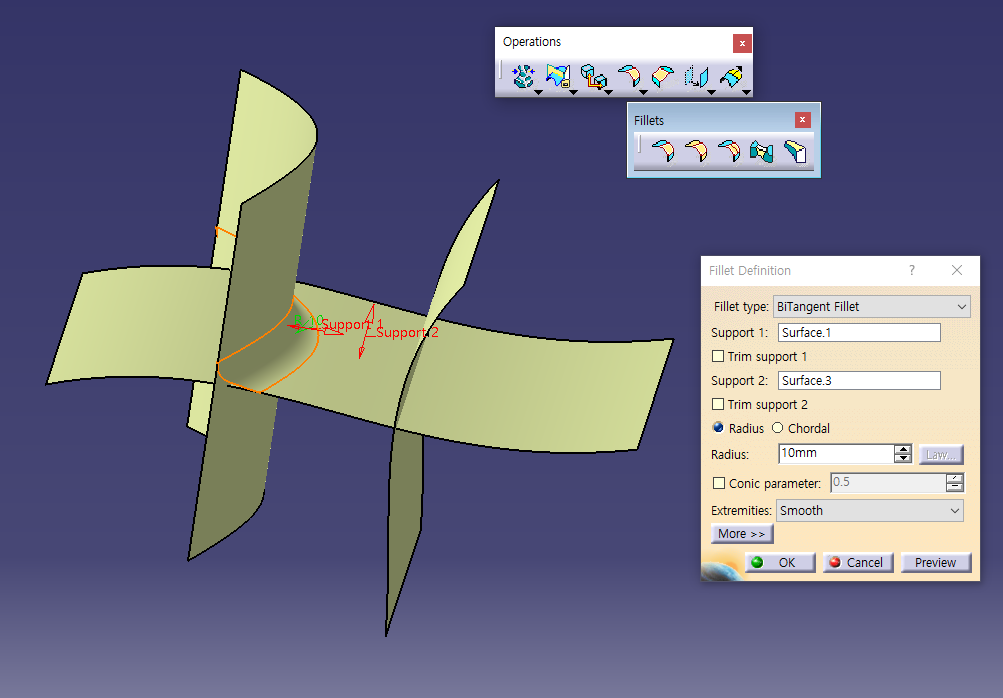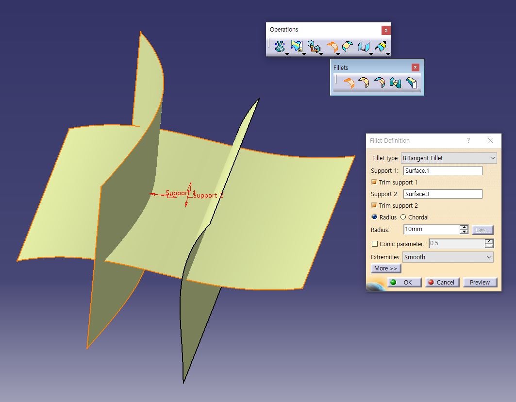 Trim support 해지하면 사라지지않고 Fillet 됨.