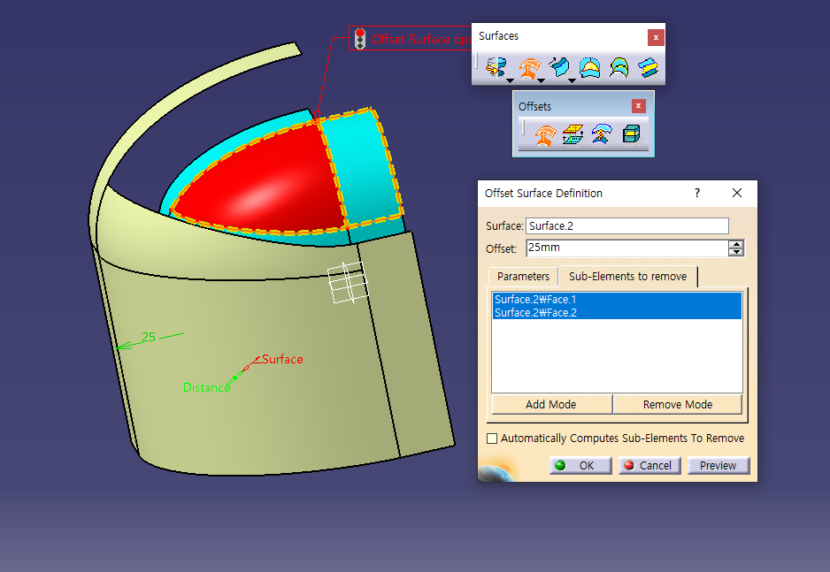 Offset 된 Surface는 원래 Surface의 Normal 방향으로 Offset된 양 만큼 커지거나 작아짐.