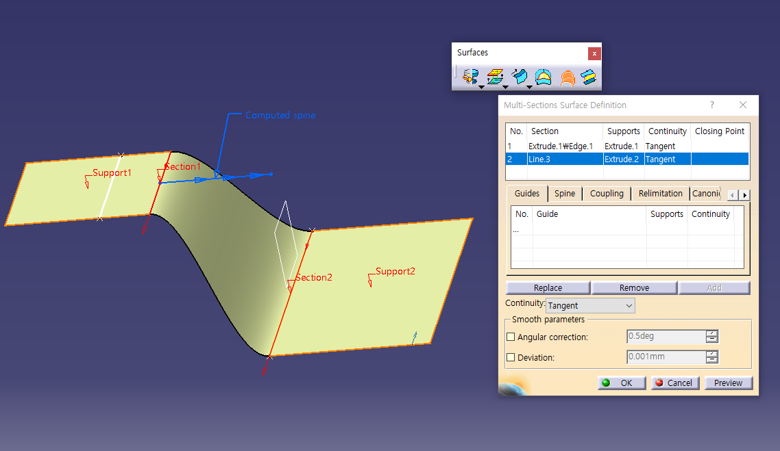 Multi-Sections Surface Definition은 단면을 여러 개 사용할 수 있고, 가이드 커브를 사용할 수 있음.