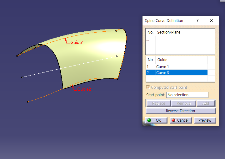 너무 작은 반지름 값을 넣으면 안 만들어지고 너무 크면 넘어가기 때문에 Guide curve와 surface 사이의 거리를 알아야 함.