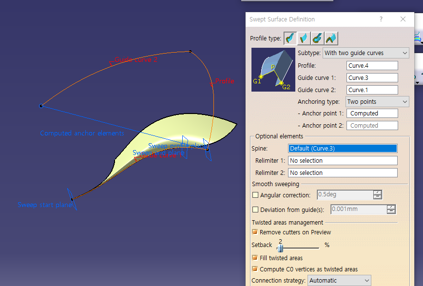 Profile이 Guide curve를 그냥 따라감.