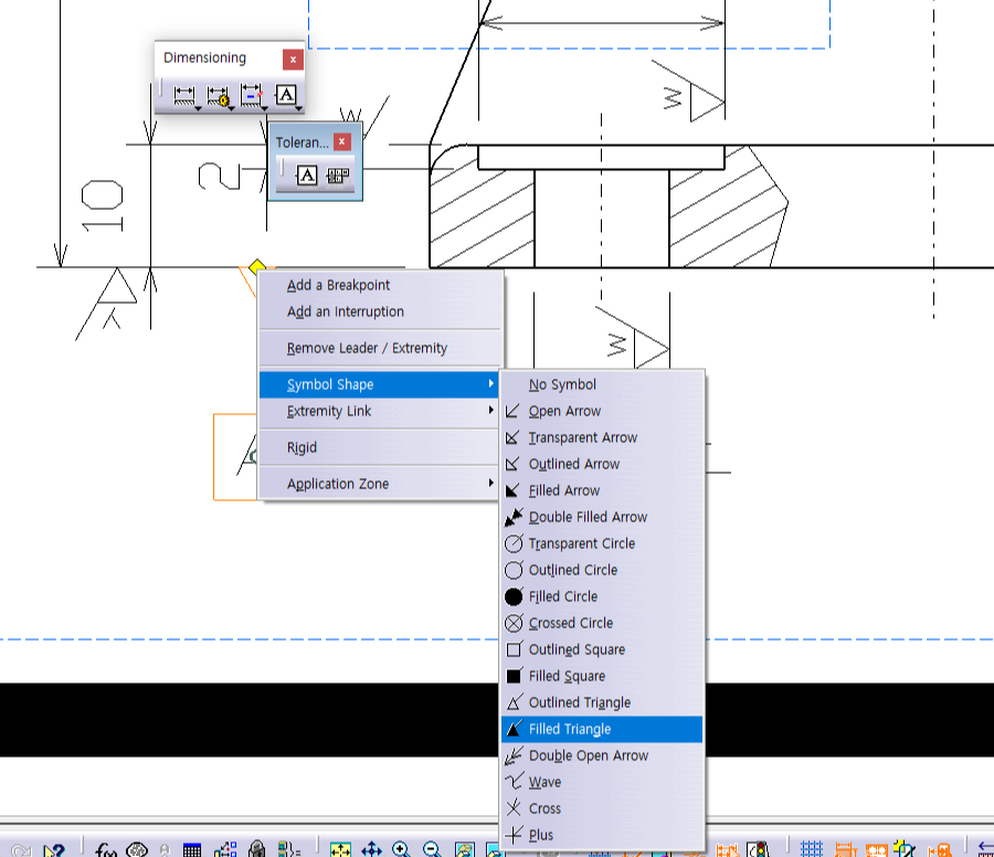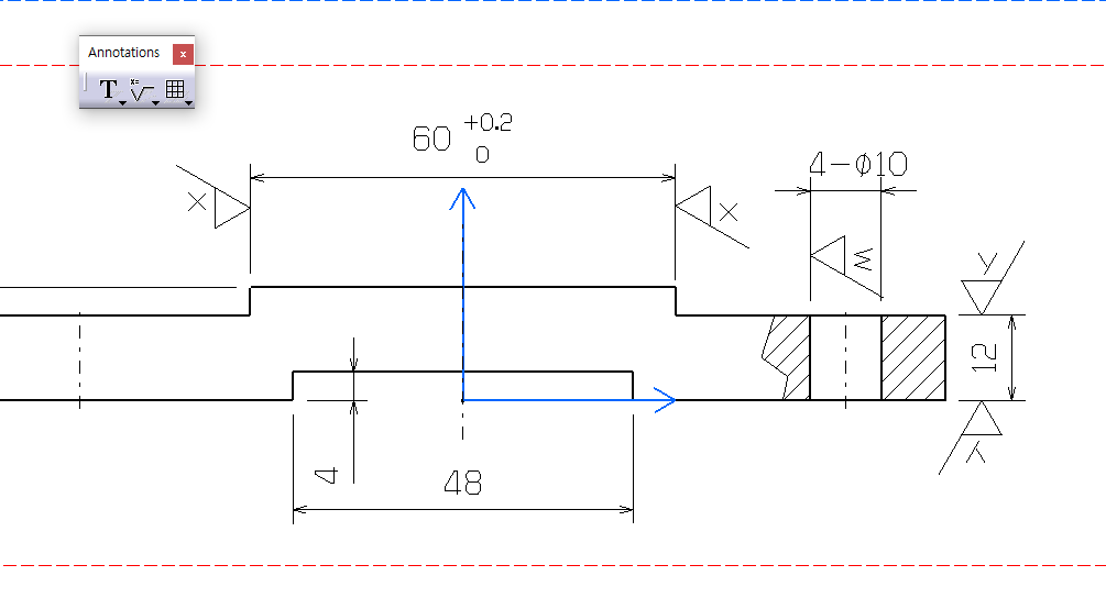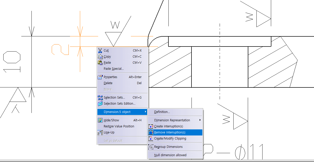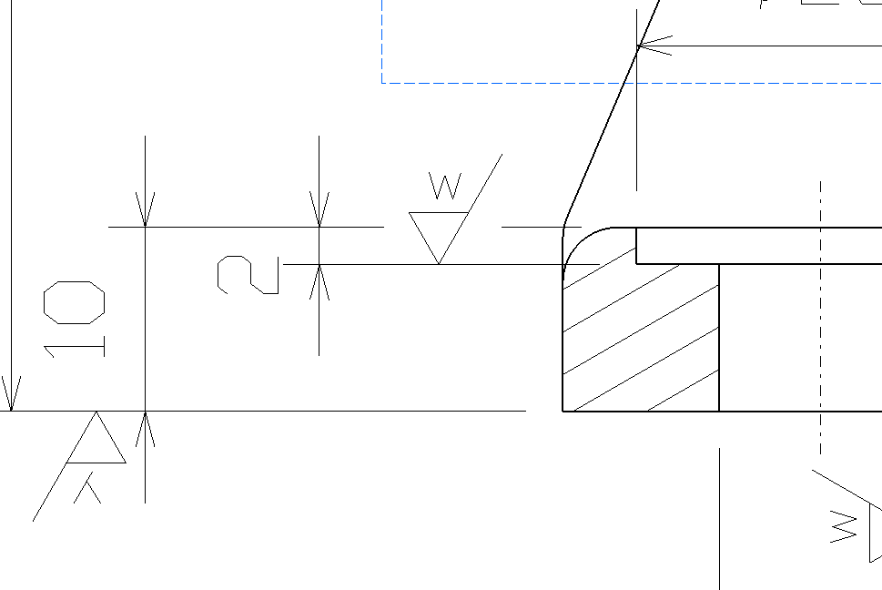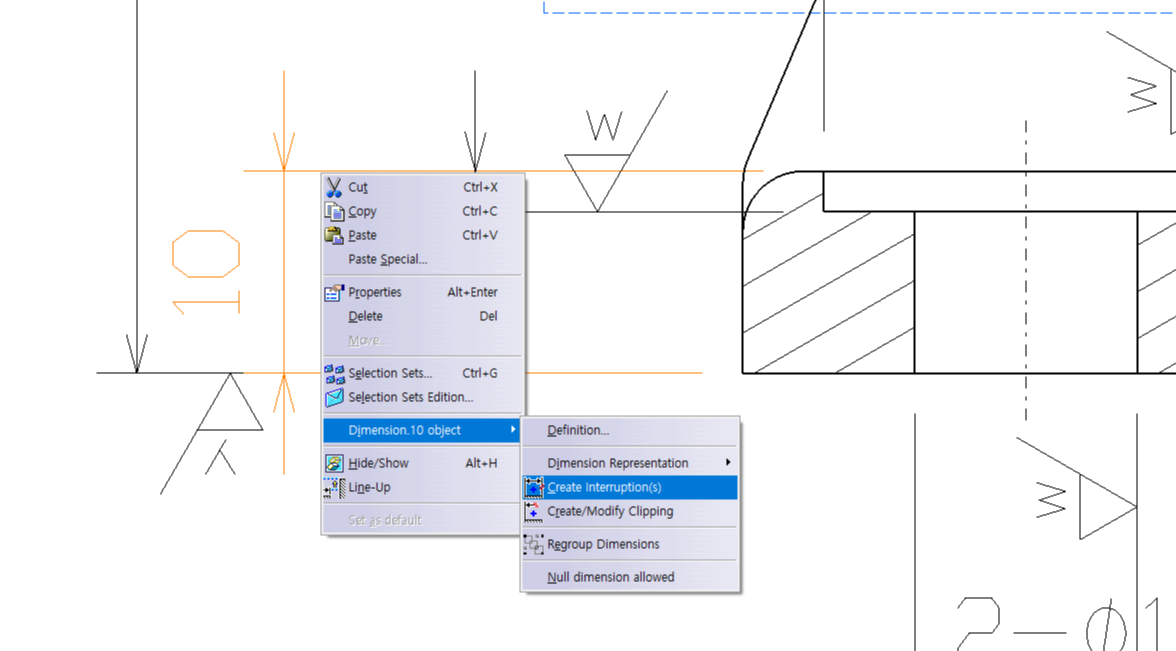 치수 10과, 치수 2 둘다 해주면 아래 사진처럼 다듬질 기호가 안 겹치게 나옴.
